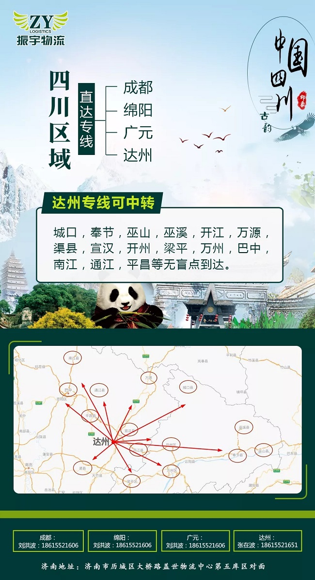 達(dá)州專線可中轉(zhuǎn)城口,奉節(jié),巫山,巫溪,開江,萬源,渠縣,宣漢,開州,梁平,萬州,巴中,南江,通江,平昌等無盲點(diǎn)到達(dá),解決大件異行設(shè)備的中轉(zhuǎn)困難!