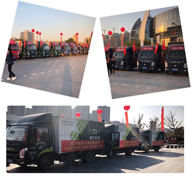 振宇物流積極捐贈(zèng)圖書,為愛護(hù)航 ,通過自己的方式和力量,助力百萬圖書大漂流!現(xiàn)場物流車輛整齊排開,氣勢如虹……