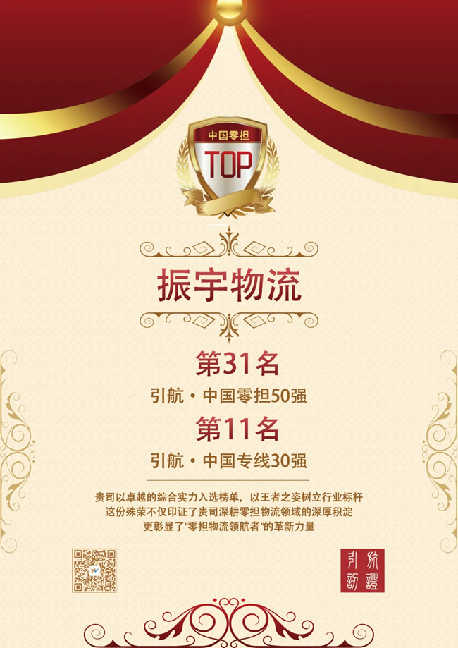 【喜報】振宇物流榮膺《2025引航·中國零擔50強排行榜、2025引航·中國專線30強排行榜》!