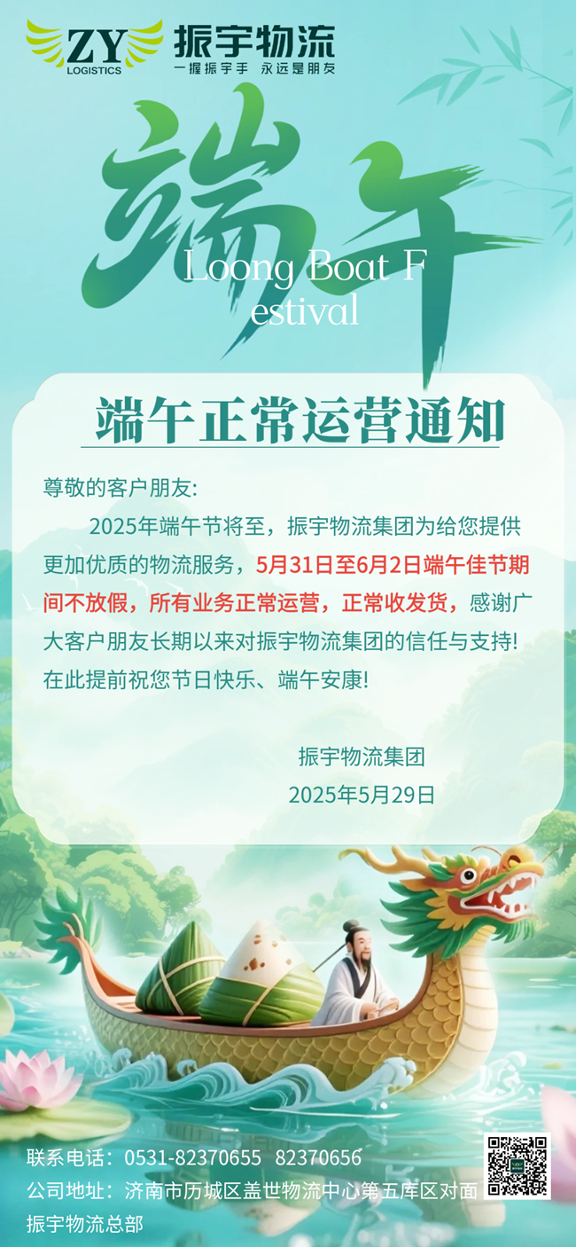 2025年端午節(jié)將至,振宇物流集團為給您提供更加優(yōu)質(zhì)的物流服務,5月31日至6月2日端午佳節(jié)期間不放假,所有業(yè)務正常運營,正常收發(fā)貨,感謝廣大客戶朋友長期以來對振宇物流集團的信任與支持!在此提前祝您節(jié)日快樂、端午安康!