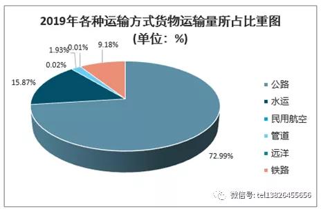 從貨物運輸?shù)姆绞嚼?,公路運輸仍然占據(jù)著我國貨物運輸行業(yè)的主導(dǎo)地位。2019年各種貨運運輸量中公路運輸量占比最大,達(dá)到了72.99%;其次為水運,占比為15.87%;鐵路運輸量占比9.18%,位居第三。我國民航運輸業(yè)起步較晚,仍處于發(fā)展階段,貨機數(shù)量整體來說相對較少,這導(dǎo)致2019年民航貨運量占比僅有0.02%。