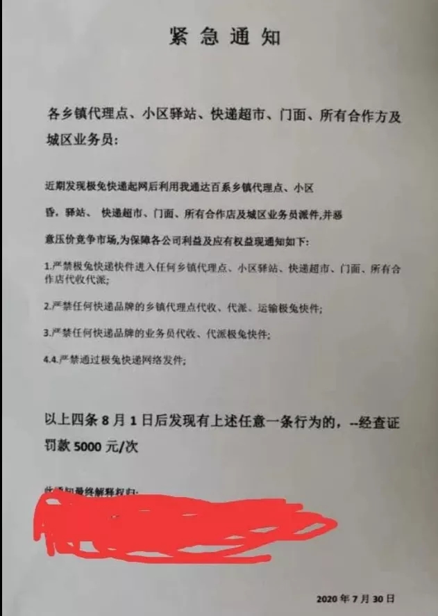 7月底,有某通達(dá)系快遞總部下發(fā)通知,要求全網(wǎng)各網(wǎng)點(diǎn)禁止代理極兔速遞業(yè)務(wù),通知指出,攬派兩端加盟公司不得以任何理由、任何形式代理極兔速遞業(yè)務(wù)。還有通知指出,如果通達(dá)百系中鄉(xiāng)鎮(zhèn)代理點(diǎn)、小區(qū)、驛站、快遞超市等業(yè)務(wù)員因惡性低價競爭攬收極兔速遞的,經(jīng)查證,每次予以5000元罰款。