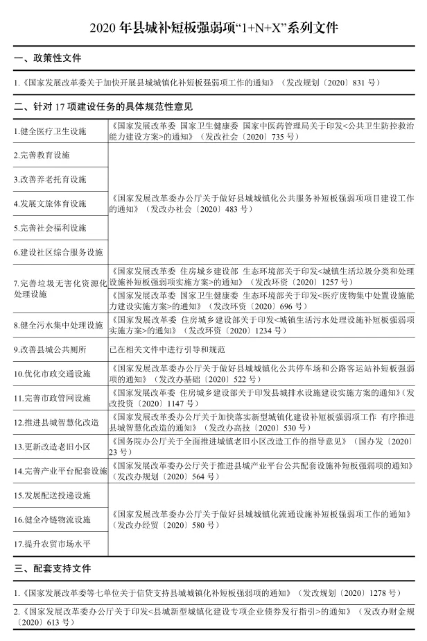 2020年5月29日,國家發(fā)展改革委印發(fā)《關(guān)于加快開展縣城城鎮(zhèn)化補短板強弱項工作的通知》,聚焦縣城及縣級市城區(qū),兼顧鎮(zhèn)區(qū)常住人口10萬以上的非縣級政府駐地特大鎮(zhèn)、2015年以來“縣改區(qū)”“市改區(qū)”形成的地級及以上城市市轄區(qū),將公共服務(wù)設(shè)施、環(huán)境衛(wèi)生設(shè)施、市政公用設(shè)施、產(chǎn)業(yè)培育設(shè)施4大領(lǐng)域共17項建設(shè)任務(wù)作為建設(shè)重點,明確了總體要求、主要任務(wù)、要素保障和組織實施方式,公布了縣城城鎮(zhèn)化補短板強弱項項目范疇和縣城新型城鎮(zhèn)化建設(shè)示范地區(qū)名單。