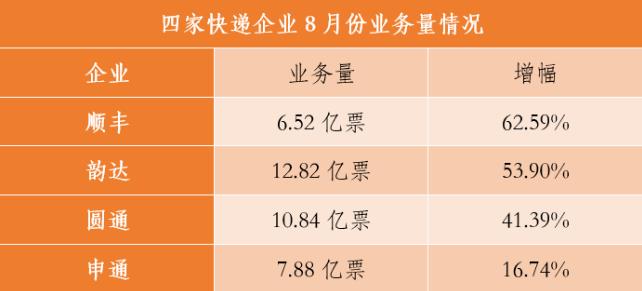 9月18日晚間,順豐控股、圓通速遞、韻達(dá)股份和申通快遞四家企業(yè)發(fā)布8月經(jīng)營簡報。數(shù)據(jù)顯示,四家快遞企業(yè)繼續(xù)保持高速增長。其中,順豐業(yè)務(wù)量增幅繼續(xù)領(lǐng)跑,韻達(dá)連續(xù)五個月、圓通連續(xù)四個月單月業(yè)務(wù)量破10億票。