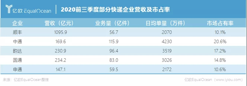 億歐EqualOcean從國(guó)家郵政局獲悉,2020年中通、韻達(dá)、圓通、申通、順豐所占市場(chǎng)份額分別為20.4%、17.02%、15.18%、10.58%和9.8%。與2020年前三季度相比數(shù)據(jù)波動(dòng)不明顯,各家市場(chǎng)表現(xiàn)平分秋色。