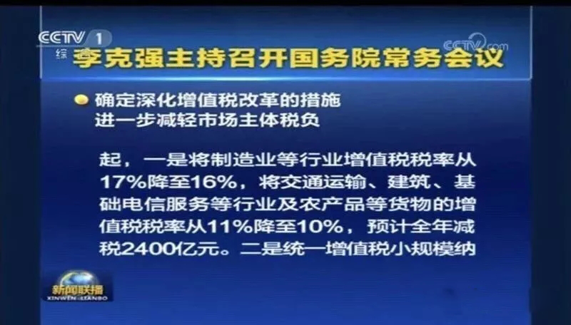 會(huì)議指出,過去五年通過實(shí)施營(yíng)改增累計(jì)減稅2.1萬億元。按照黨中央、國(guó)務(wù)院部署,為進(jìn)一步完善稅制,支持制造業(yè)、小微企業(yè)等實(shí)體經(jīng)濟(jì)發(fā)展,持續(xù)為市場(chǎng)主體減負(fù),會(huì)議決定,從2018年5月1日起,一是將制造業(yè)等行業(yè)增值稅稅率從17%降至16%,將交通運(yùn)輸、建筑、基礎(chǔ)電信服務(wù)等行業(yè)及農(nóng)產(chǎn)品等貨物的增值稅稅率從11%降至10%,預(yù)計(jì)全年可減稅2400億元。