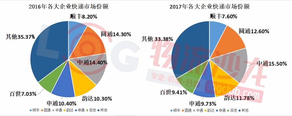 我們可以從營(yíng)收增速來(lái)看看各家企業(yè)表現(xiàn)力。具體來(lái)看,百世第一,增幅高達(dá)126%,其次是韻達(dá)、中通、申通,分別是35.9%、33.4%、28.1%,都高于郵政局公布的2017年全年快遞收入增長(zhǎng)速度(2017年行業(yè)增速為24.7%)。